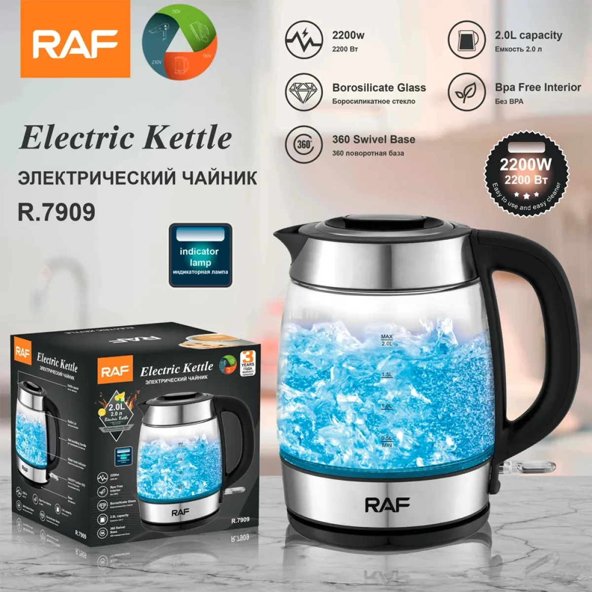Електрочайник скляний RAF 7909 2 л 2200 Вт